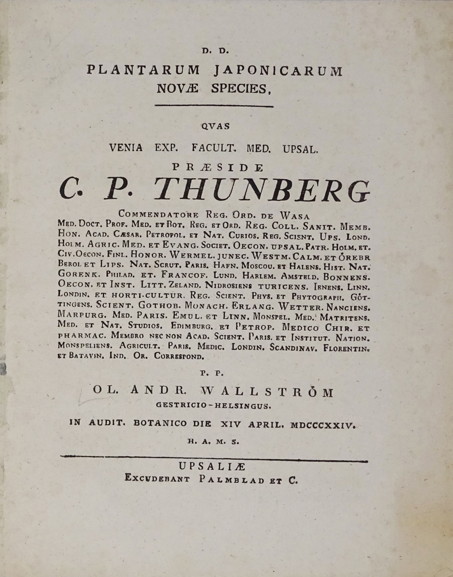 本書は、このように当時のヨーロッパにおける植物研究の第一人者となっていたトゥンベリが、日本において採取して研究の対象とした植物のうち、新種として認められるものを一覧の形で列挙して紹介した作品で、1824年4月14日に公表された記録がもとになっています。植物学研究の共通言語であるラテン語で記された短い序文では、戦争(一連のナポレオン戦争のことを指すと思われる)によって一時荒廃した諸学問がこうした新発見によって新しい光を得ることになるのは誠に喜ばしく、創造主への讃美、人類の幸福へ繋がるという旨のことが書かれていて、トゥンベリによる偉大な成果が讃えられています。