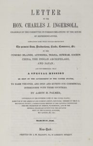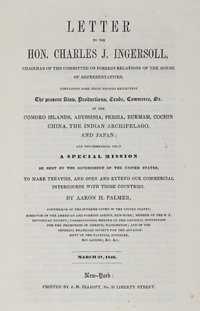 パルマーは、ニューヨークで通商の為の事務所を開いていた法曹人で、政財界とのコネクションを強める中で大陸横断鉄道実現や、太平洋を挟んだ東アジアとの交易拡大を主張するロビイング活動を活発に展開していました。彼は特に日本との通商関係を樹立することがアメリカの大きな国益になることを熱心に主張し、自ら膨大な調査報告書を作成して、政府関係者に提言を繰り返しました。パルマーがこの報告書の宛名としているインガーソール(Charles Jared Ingersoll, 1782 – 1862)は、法曹界出身の民主党下院議員として活躍した人物で、1843年から1847年にかけてアメリカ合衆国下院外交委員会委員長を務めていました。同委員会はアメリカ対外政策の重要方針の決定に大きな影響力を有する委員会で、パルマーはその委員長への書簡という形でこの報告書を執筆、刊行しています。